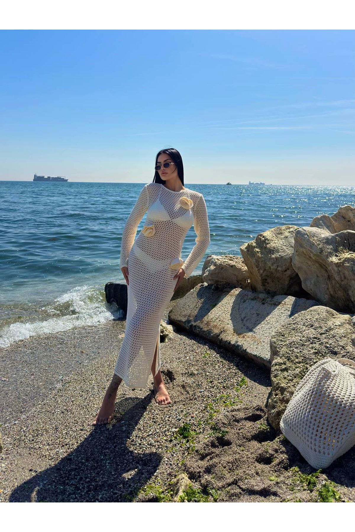 Don’t compromise on style by the sea! This long crochet beach dress offers elegant sheerness with a breezy, lightweight texture perfect for sun-soaked days. Delicate flower appliqués and a chic open-back design add a touch of femininity and boho charm. Whether poolside or on the sand, elevate your swimwear with this must-have piece and become the center of beachside attention.