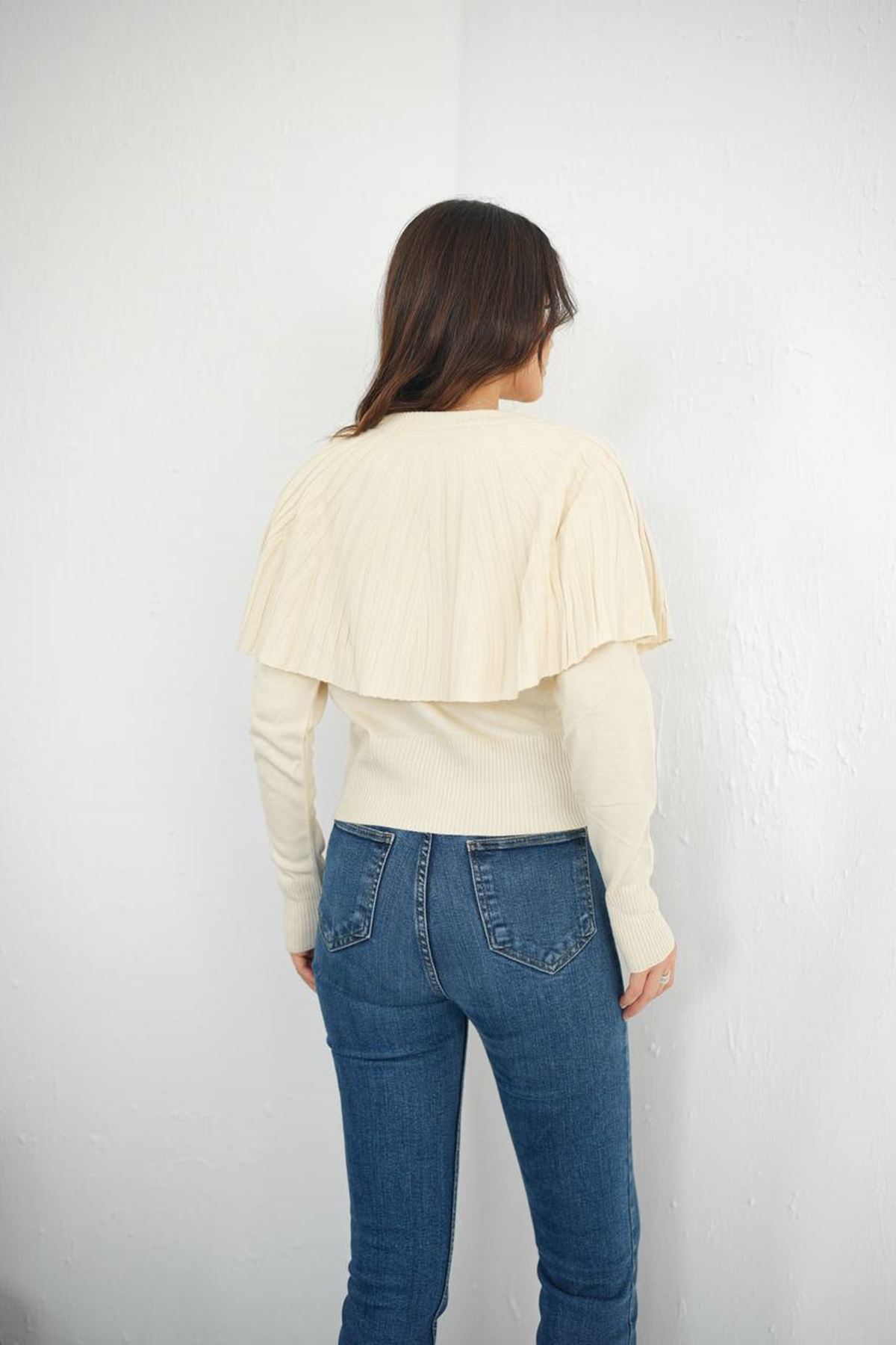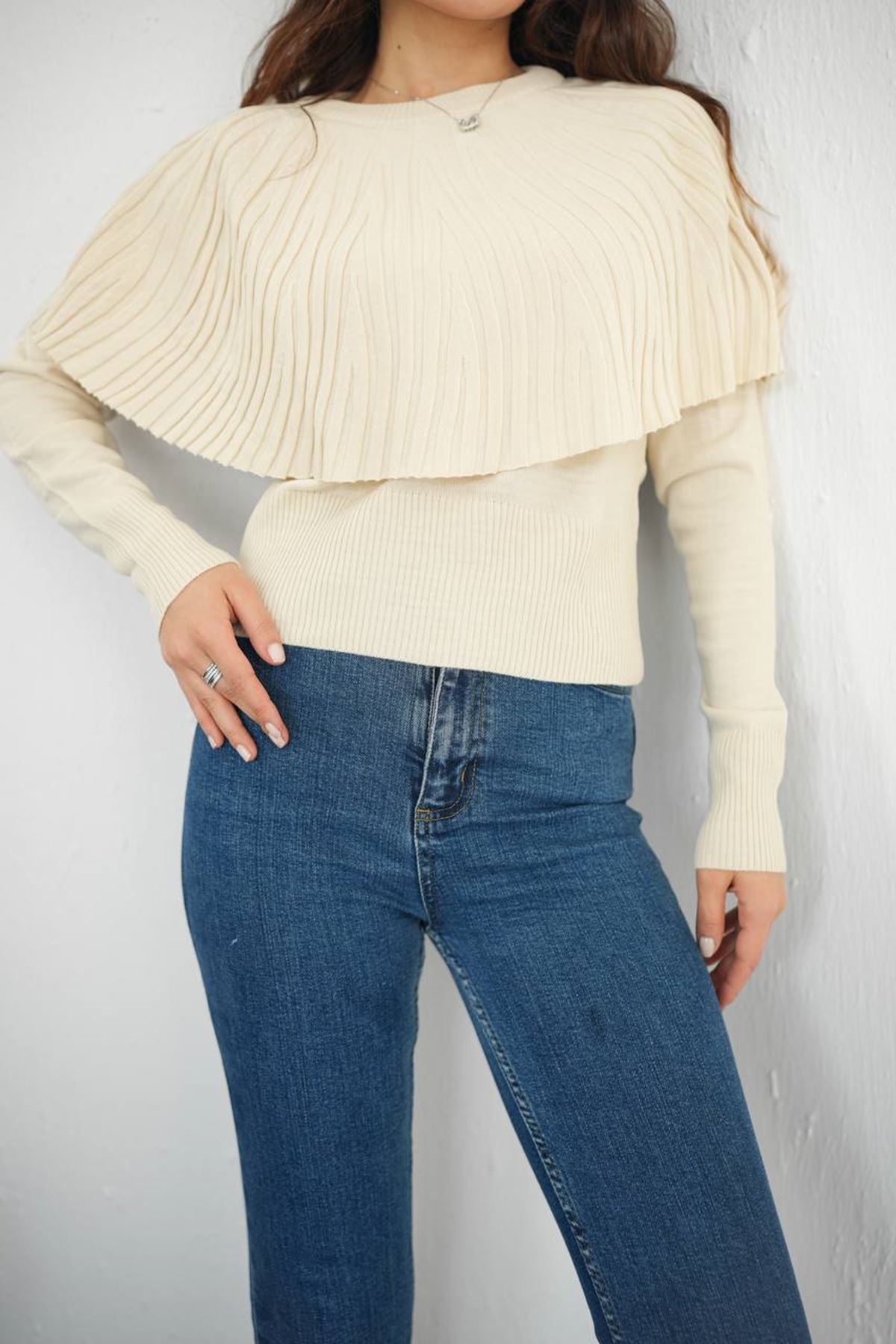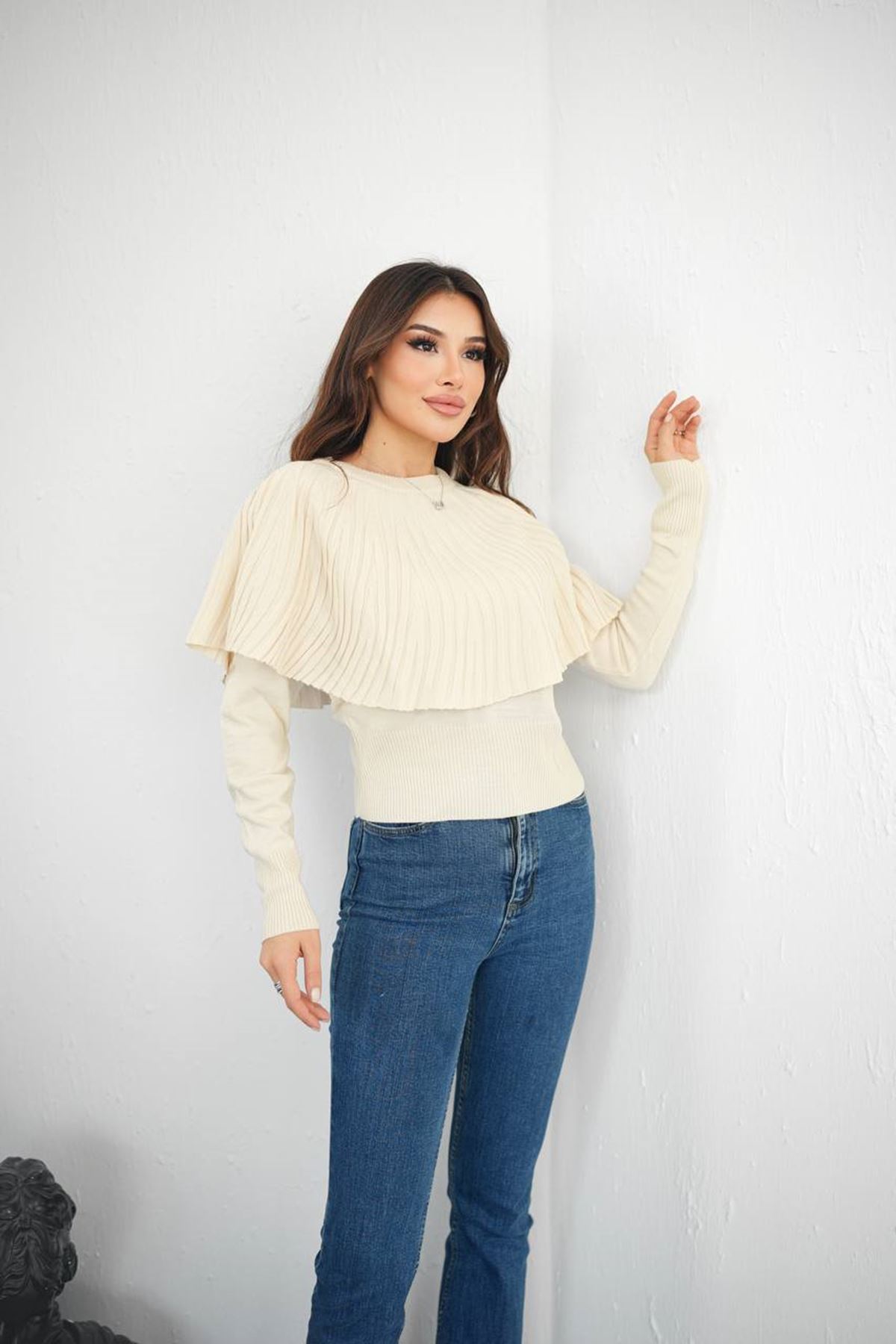 Zarafeti modern dokunuşlarla buluşturan bu triko bluz, omuzlardan dökülen gösterişli volan katmanı ile stilinizi bir anda yükseltir. İnce dokulu, esnek ve konforlu yapısı sayesinde gün boyu rahatlık sunarken, vücuda oturan fit kesimi feminen bir siluet oluşturur.