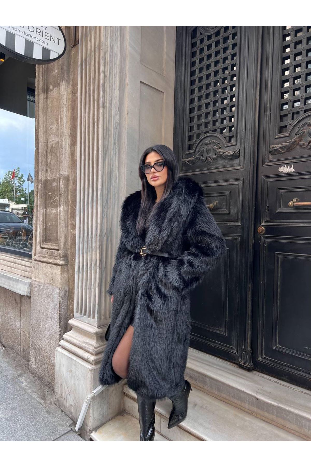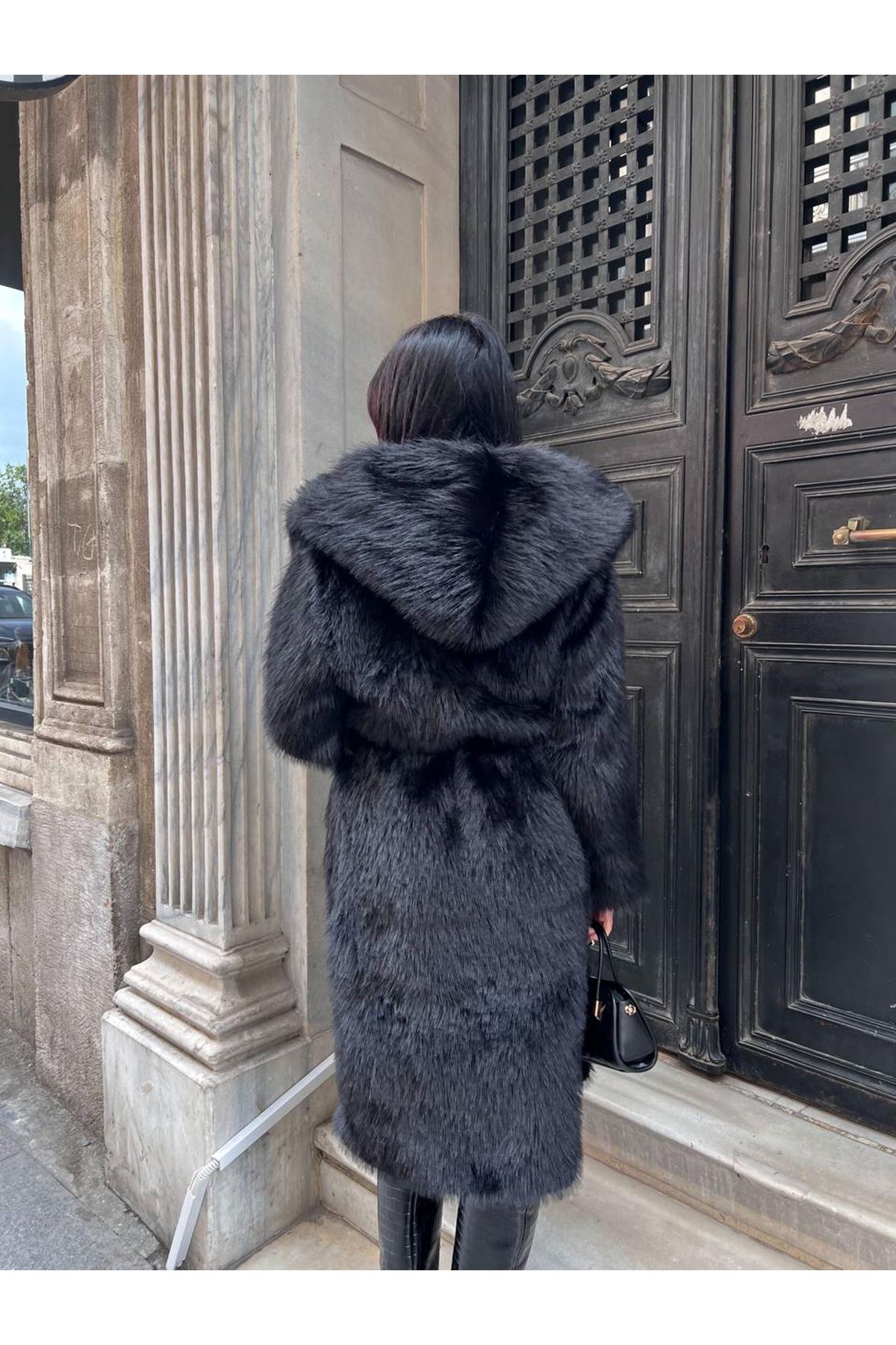 Lüks dokulu kapüşonlu suni kürk kaban, zarafeti ve sıcaklığı bir arada sunarak kış stilini bambaşka bir seviyeye taşıyor.
