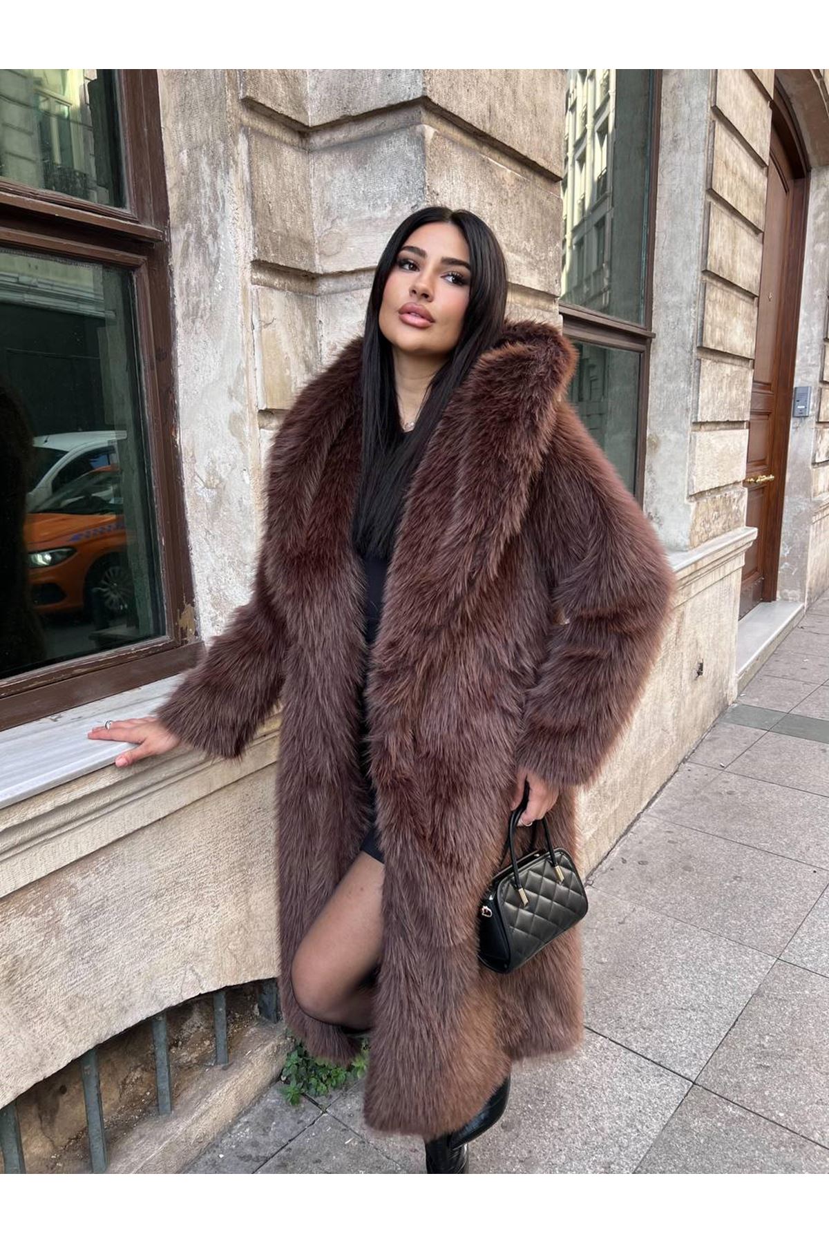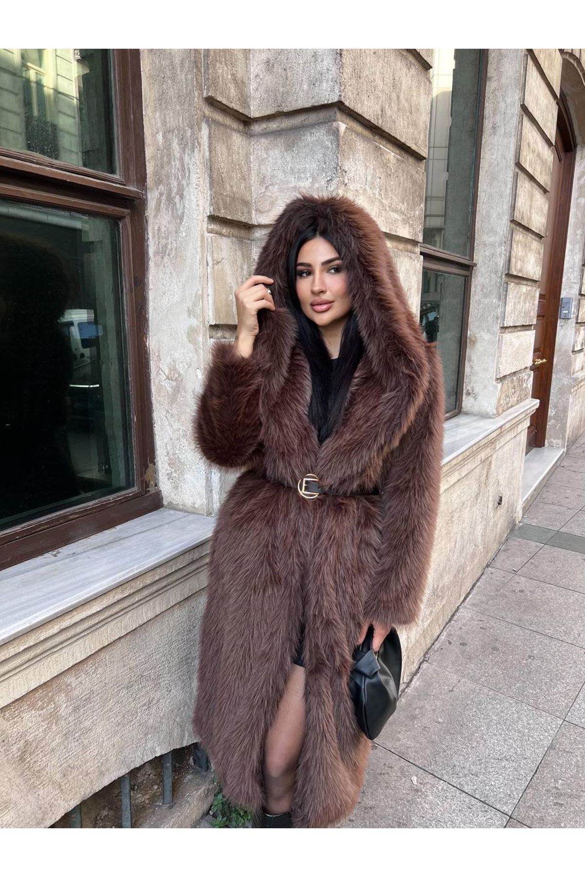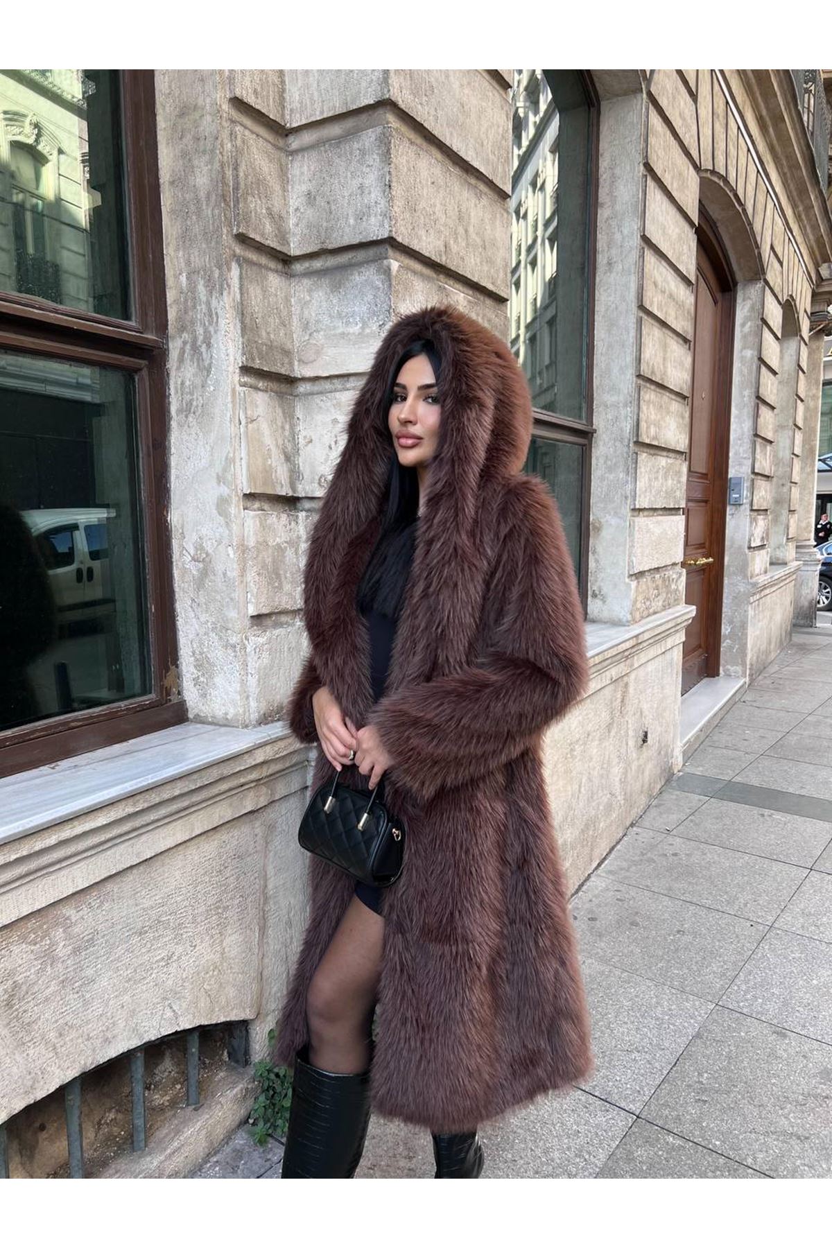 Lüks dokulu kapüşonlu suni kürk kaban, zarafeti ve sıcaklığı bir arada sunarak kış stilini bambaşka bir seviyeye taşıyor.
